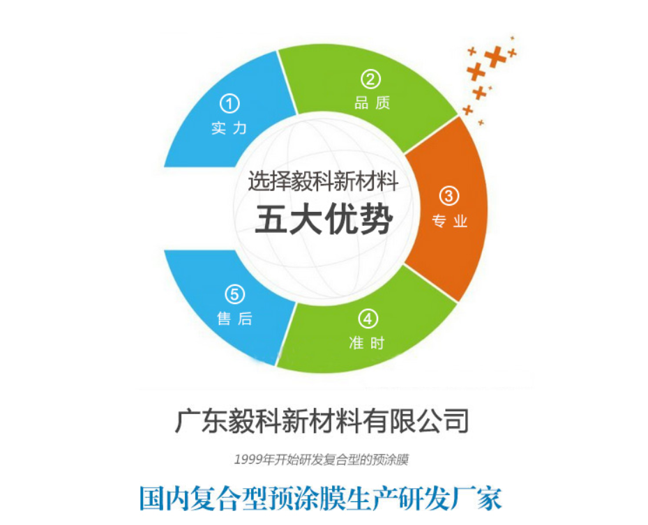 广东毅科新材料有限公司从1999年开始研发复合型的预涂膜,也是国内复合型预涂膜生产研发厂家,十几年来我们不断努力改进产品,优化产品性能,制造多元化复合材料产品。公司主营产品BOPP预涂膜、PET预涂膜、数码印刷预涂膜 ,广告喷绘热裱膜,PET地暖复合材料,产品应用于包装印刷覆膜、办公用品覆膜,广告热裱覆膜、建筑复合材料、光学复合材料等领域 。公司已通过ISO09001:2008质量管理体系认证、绿色印刷环保标志认证、国家高新技术企业认定;EVA型预涂膜行业标准制定单位等荣誉,先进的ERP系统管理,注重知识产权的开发和应用,授权实用新型专利有多项,申请发明专利多项;还拥有一支优秀的研发团队,专业知识和技术经验丰富,能为产品的质量提供强而有力的技术支撑。有良好的企业氛围和浓厚的乐竞·体育,我司运用5S的管理营造一目了然的工作环境,养成良好的工作习惯,提升员工水平,一起营造一个和谐美好的工作环境,从而达到规范化管理。 感恩,价值,共进,分享是我们的理念,“双赢”是我们的经营方针,我们将进一步完善企业质量管理体制,为客户提供更优质的产品和服务。