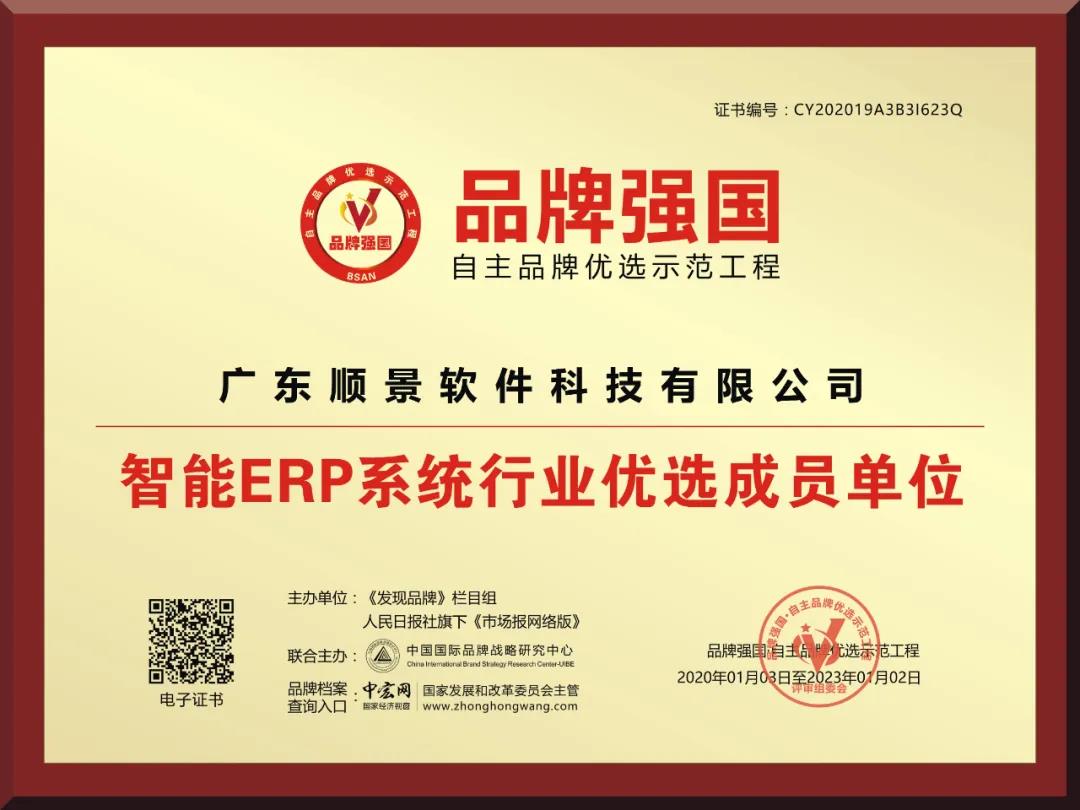 经由品牌强国示范工程东莞地区运营中心审核、认证、社会公示,“顺景软件”符合示范工程评选标准,成功入选为品牌强国示范工程智能ERP系统行业优选成员单位,企业信息录入品牌强国示范工程数据库,在国家级平台展示品牌形象。